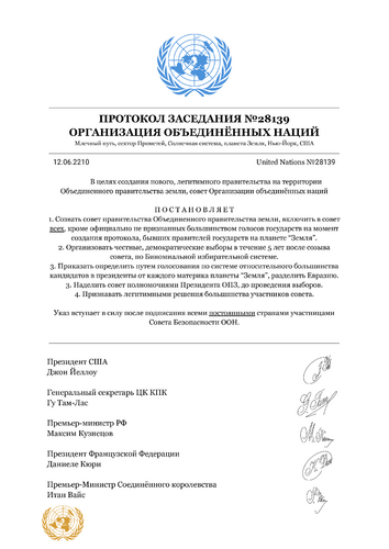 Официальным днём создания Объединённого правительства земли считается 2210 год, момент окончания колонизации солнечной системы. Первой проблемой стало определение нового правительства, по итогу нескольких раундов заседаний всех прошлых правителей государств на Земле было принято, а позже и официально закреплено решение о создании правящего совета, в состав которого вошли все правители государств на Земле.