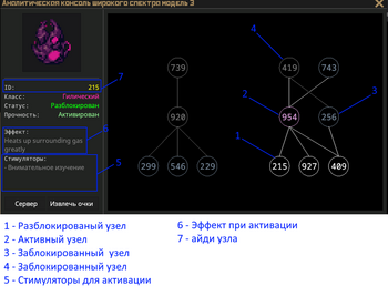 Мы наблюдаем окно анализатора, здесь уже всё пронумеровано и подписано для удобства. Структура артефакта может очень сильно разниться, знайте. Нажимаем на серый, заблокированный узел. Смотрим какие у него стимуляторы, сравниваем с таблицей, выполняем их на артефакте. Тот в ответ должен выдать сообщение «Он начинает меняться странным образом.», и начать переливаться различными цветами. Если все условия были выполнены, то спустя 10 секунд (минимум) артефакт активируется с характерным звуком, выдав следующее сообщение: *«Он замедляется, визуально меняясь.»*. В ином случае, если условия не выполнены, будет следующее сообщение: «Он замедляется, а затем плавно останавливается.», переливание прекратится.